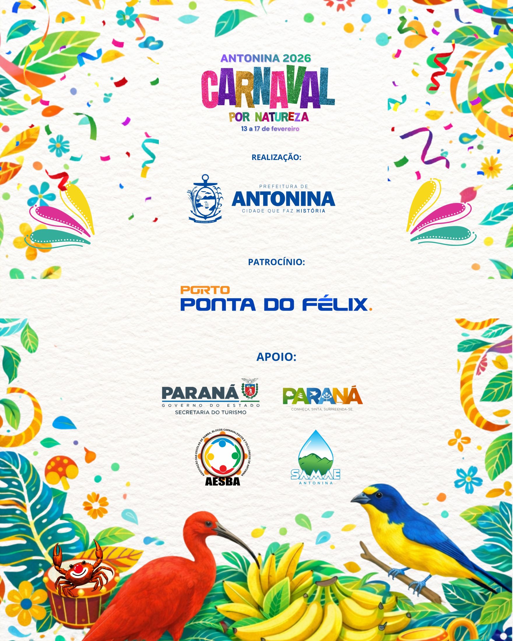 A Prefeitura de Antonina divulga a programação oficial do Carnaval 2026, uma das festas mais tradicionais e aguardadas do litoral do Paraná. Serão cinco dias de muita alegria, cultura e tradição, com atrações que valorizam o samba, os blocos, as escolas e a energia contagiante que toma conta da cidade. A programação foi pensada para moradores e visitantes, garantindo diversão, segurança e momentos inesquecíveis na avenida e nos diversos pontos da cidade.