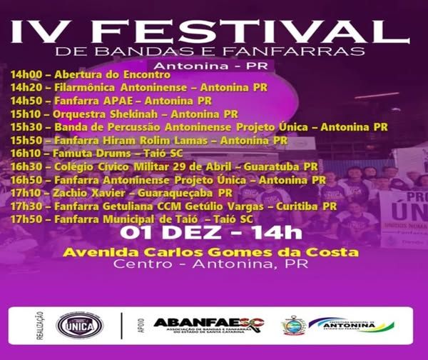 A Prefeitura de Antonina convida a todos para o IV Festival de Bandas e Fanfarras, que acontecerá neste domingo (01) à partir das 14h no Palco Principal na Avenida Carlos Gomes da Costa. Venha apreciar conosco diversidade cultural e musical, com apresentações de bandas e fanfarras de várias localidades.