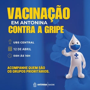 A Prefeitura de Antonina, através da Secretaria Municipal de Saúde, realiza neste sábado (12) de abril, a vacinação contra a gripe (Influenza) na Unidade Básica de Saúde Central (UBS Central). A imunização acontecerá das 8h às 16h, sem necessidade de agendamento.