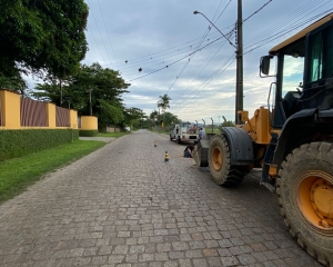 A equipe da Secretaria de Obras está atuando com a reposição e nivelamento dos paralelepípedos, corrigindo pontos danificados pelo tempo e pelo uso intenso da via.