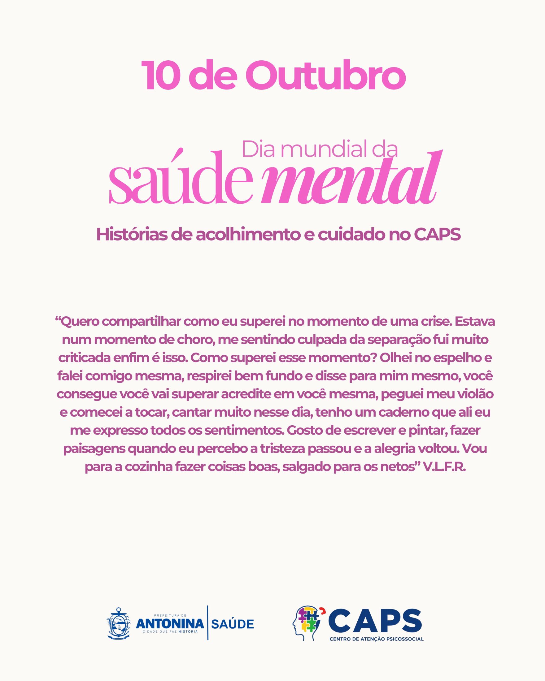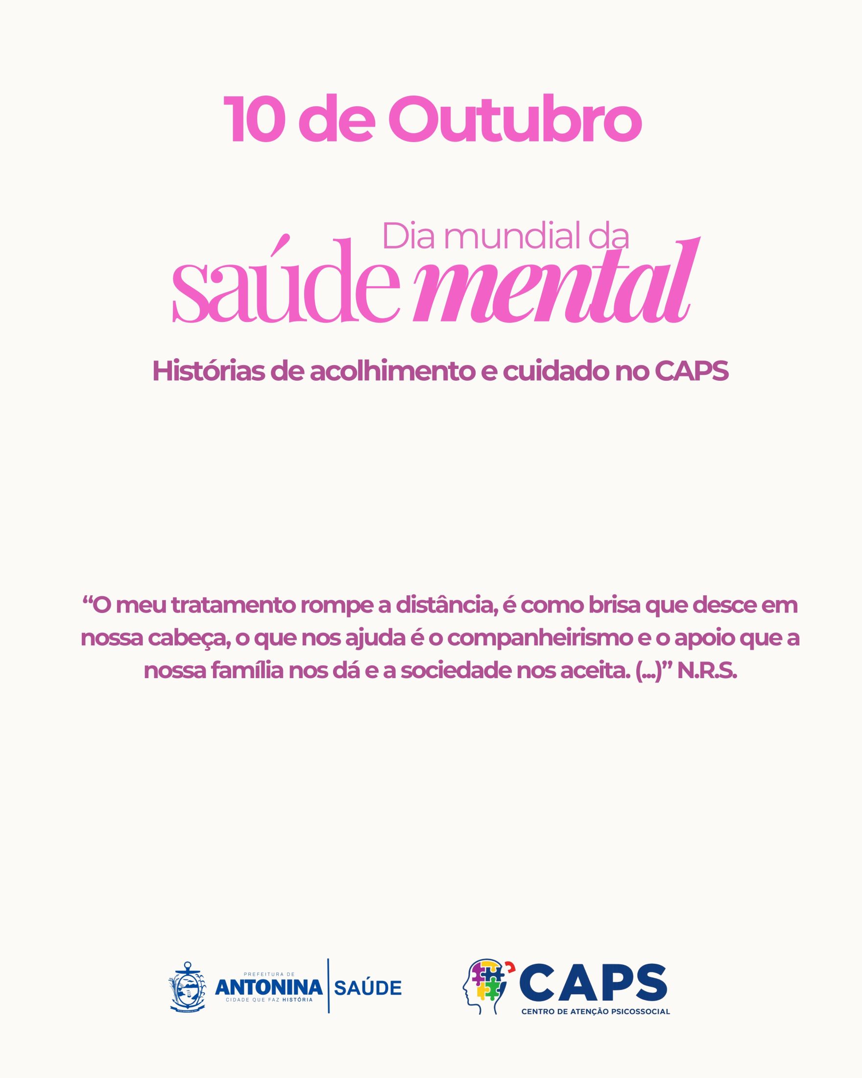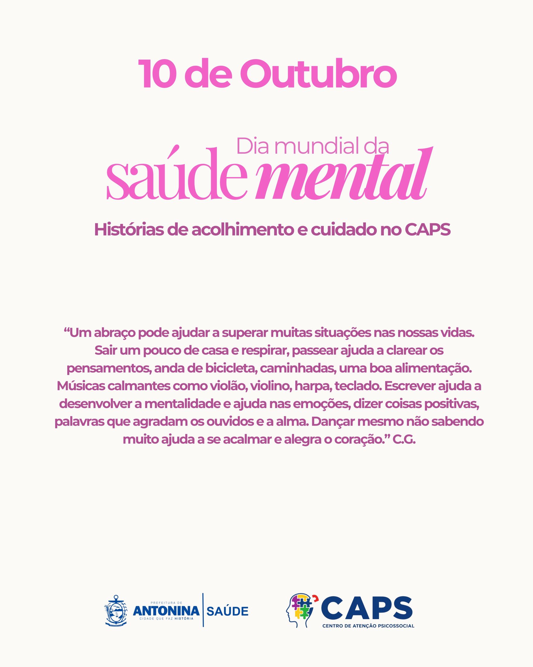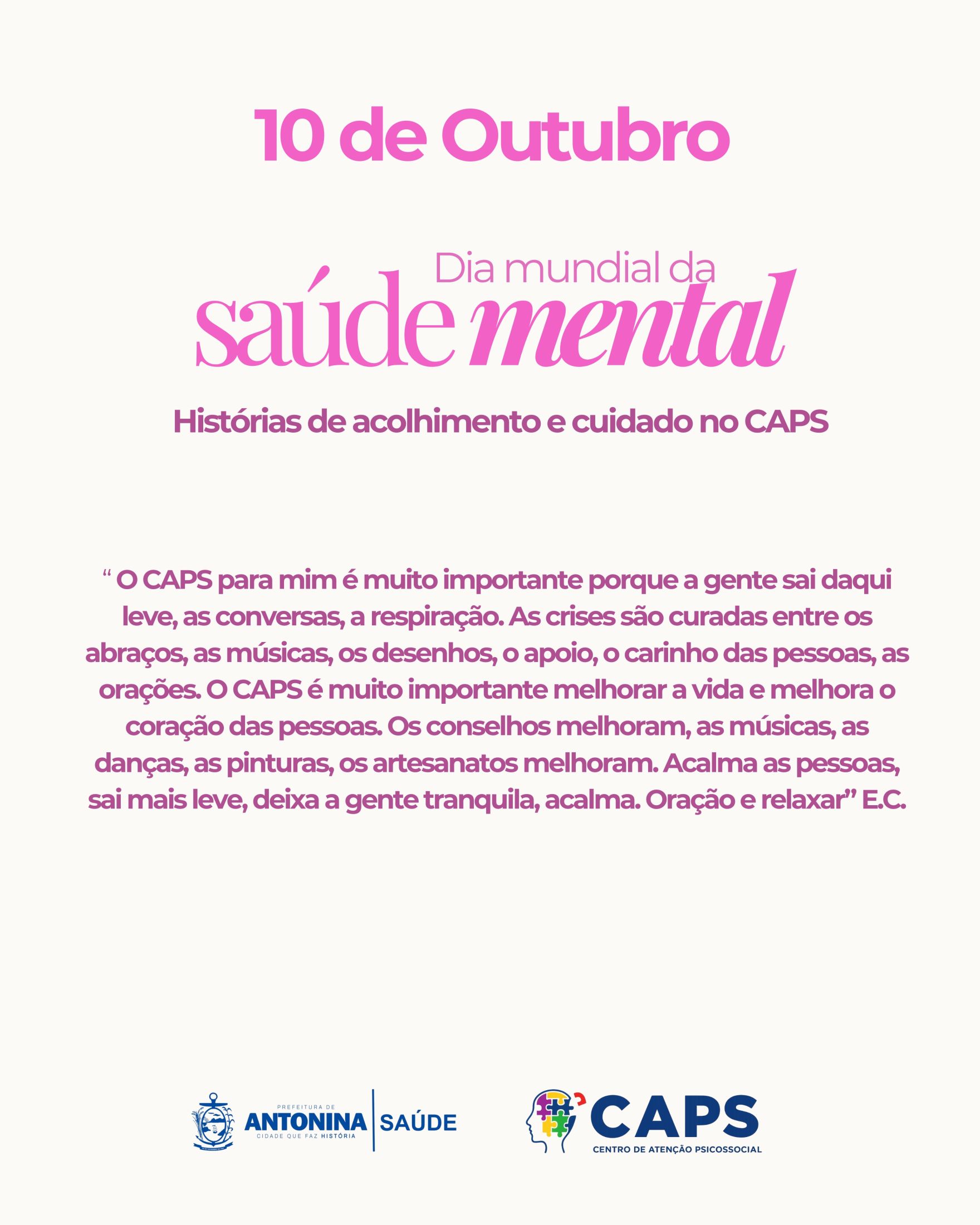 No dia 10 de outubro, celebra-se o Dia Mundial da Saúde Mental, uma data dedicada à conscientização sobre a importância do cuidado emocional e psicológico. Em Antonina, a Prefeitura, através da Secretaria Municipal de Saúde e do Centro de Atenção Psicossocial (CAPS), oferece atendimento especializado para pessoas que precisam de suporte, terapias e acolhimento, promovendo saúde mental de forma integral.