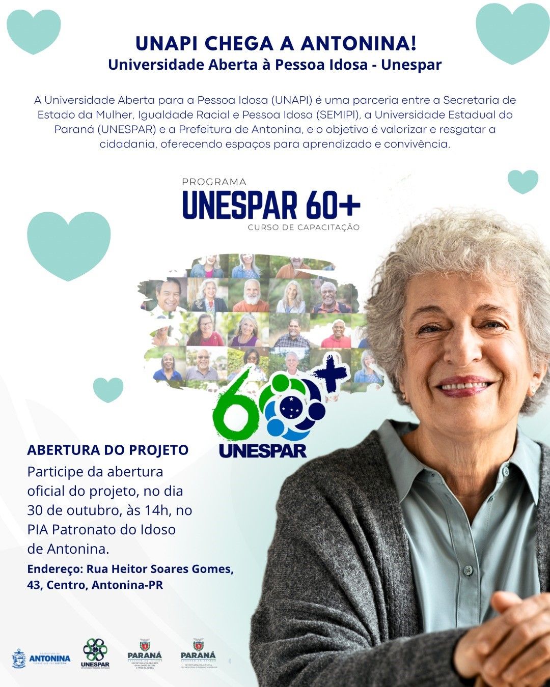 Antonina agora conta com um novo espaço dedicado ao aprendizado, à convivência e à valorização da pessoa idosa. O município passa a integrar o Programa Universidade Aberta da Pessoa Idosa (UNAPI), uma iniciativa do Governo do Estado do Paraná, por meio da Secretaria da Mulher, Igualdade Racial e Pessoa Idosa (SEMIPl), em parceria com a Universidade Estadual do Paraná (UNESPAR) e a Prefeitura de Antonina.