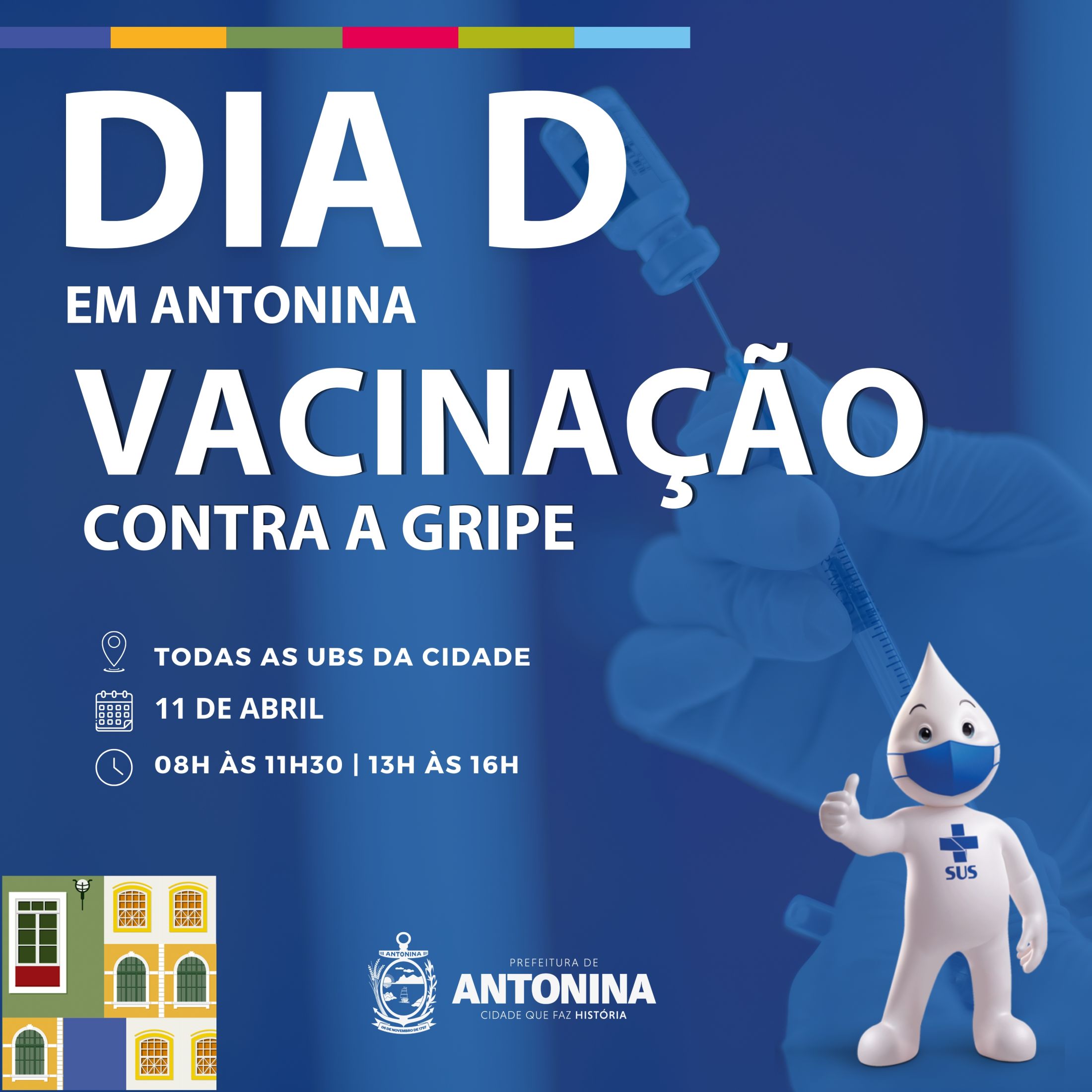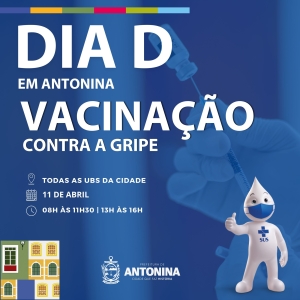 A Prefeitura de Antonina informa que o Dia D da vacinação contra a gripe acontece no próximo dia 11 de abril. A adequação no calendário ocorre após contratempo no repasse das doses para municípios do Litoral do Paraná, o que impede a abertura de todas as salas de vacinação na data inicialmente prevista pelo Estado, em 28 de março.