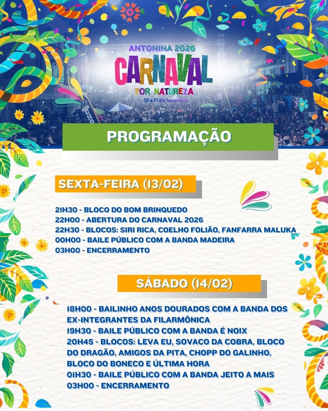 20h45 – Blocos: Leva Eu, Sovaco da Cobra, Amigos da Pita, Bloco do Dragão, Chopp do Galinho, Bloco do Boneco e Última Hora
