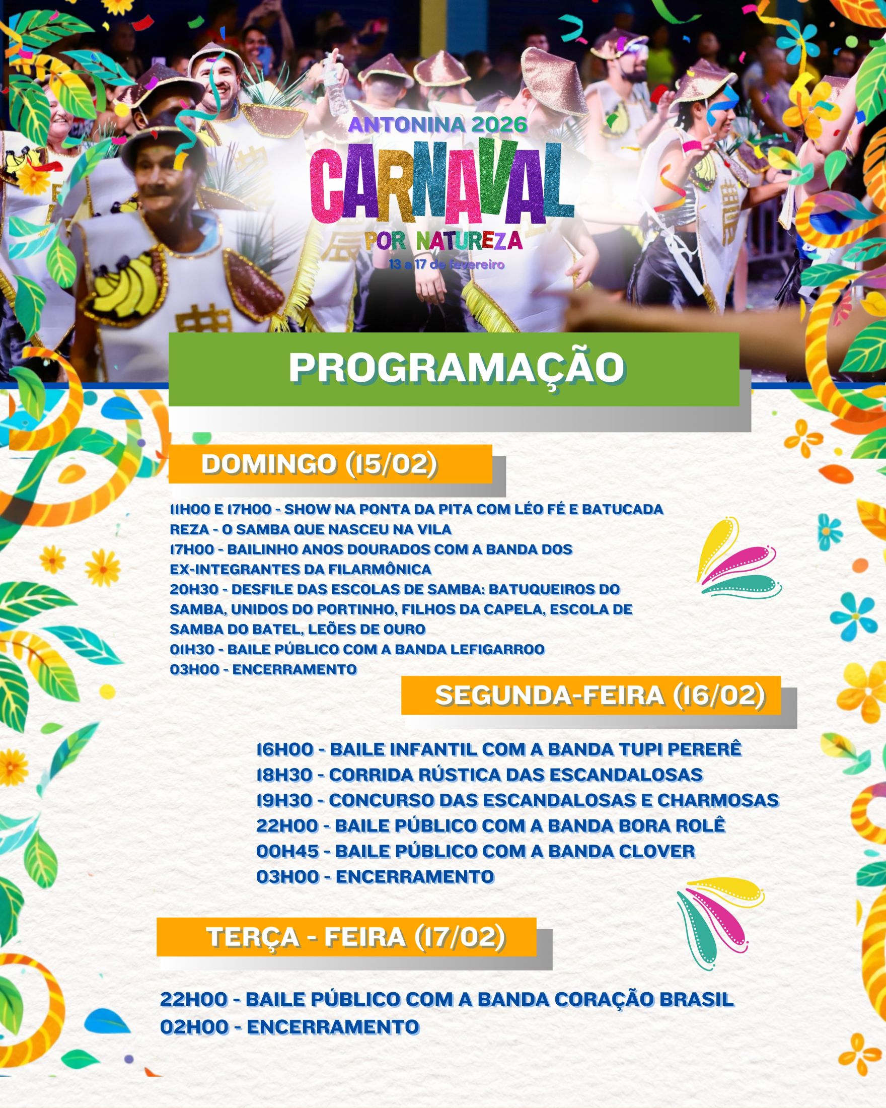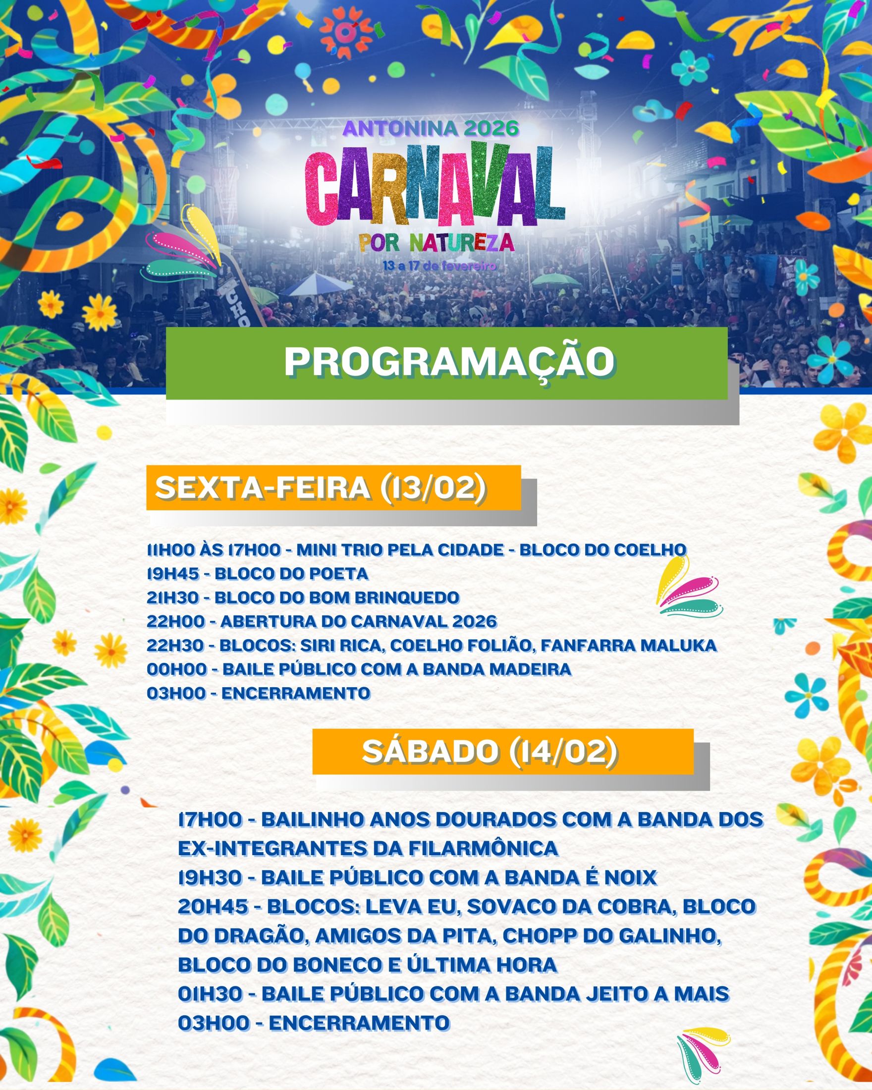 20h45: Desfile dos Blocos: Leva Eu, Sovaco da Cobra, Bloco do Dragão, Amigos da Pita, Chopp do Galinho, Bloco do Boneco e Última Hora